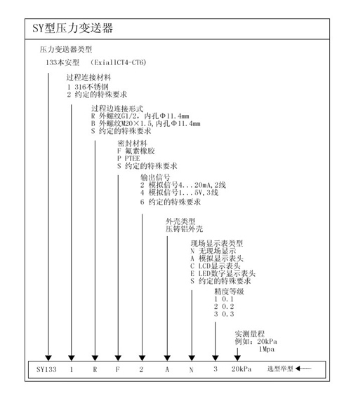 SY133型压力变送器是SY系列产品的标准型号,内置陶瓷电容式传感器。可以自由选配模拟、数字现场显示表头。有多种过程连接件,可以现场调节零点、满量程。广泛应用于自动化工业中对液体、气体和蒸汽的测量